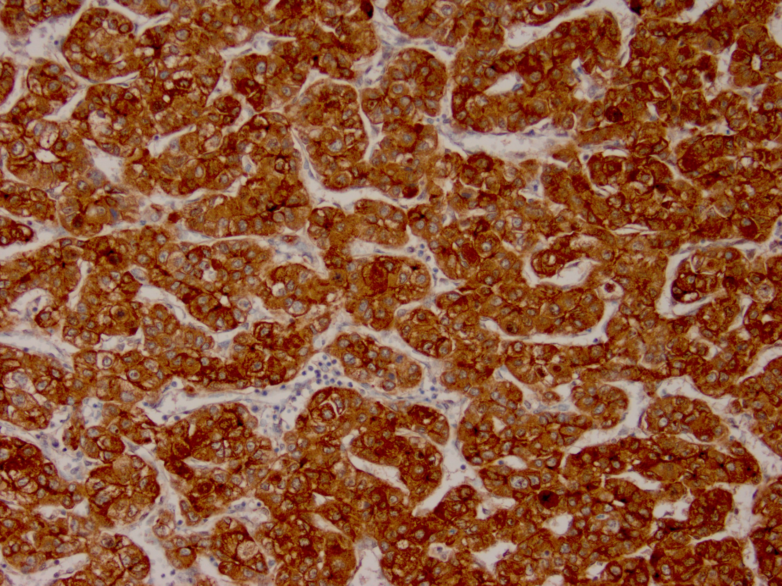 Zeta Glypican-3 Antibody. Zeta’s rabbit recombinant antibody recognizes Glypican-3 (GPC3), a glycosylphospatidyl inositol-anchored membrane protein, which may also be found in a secreted form. Zeta’s antibody against Glypican-3 (GPC3) has been identified as a useful tumor marker for the diagnosis of hepatocellular carcinoma (HCC), hepatoblastoma, melanoma, testicular germ cell tumors, and Wilm’s tumor. In patients with HCC, Glypican-3 (GPC3) is overexpressed in neoplastic liver tissue and elevated in serum, but is undetectable in normal liver, benign liver, and the serum of healthy donors. Glypican-3 (GPC3) expression is also found to be higher in HCC liver tissue than in cirrhotic liver or liver with focal lesions such as dysplastic nodules and areas of hepatic adenoma (HA) with malignant transformation. In the context of testicular germ cell tumors, Glypican-3 (GPC3) expression is up regulated in certain histologic subtypes, specifically yolk sac tumors and choriocarcinoma. A high level of Glypican-3 (GPC3) expression is also found in some types of embryonal tumors, such as Wilm’s tumor and hepatoblastoma, with a low or undetectable expression in normal adjacent tissue. In patients with thyroid cancer, expression of Glypican-3 (GPC3) is dramatically enhanced in certain types of cancers: 100% in follicular carcinoma and 70% in papillary carcinoma. Expression of Glypican-3 (GPC3) in follicular carcinoma is significantly higher than that of follicular adenoma. In contrast, Glypican-3 (GPC3) is not expressed in anaplastic carcinoma.